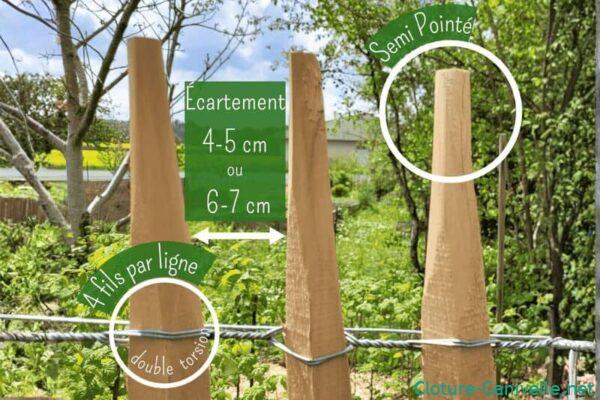 Le choix de l’acacia-robinier garantit une durée de vie supérieure à 30 ans sans traitement. Naturellement classe 4, ce bois est le seul en Europe reconnu pour rester en contact permanent avec le sol sans risque de pourrissement. Les piquets sont sciés, écorcés et issus du cœur du bois, apportant une grande homogénéité, une meilleure résistance mécanique et une finition propre sans échardes.